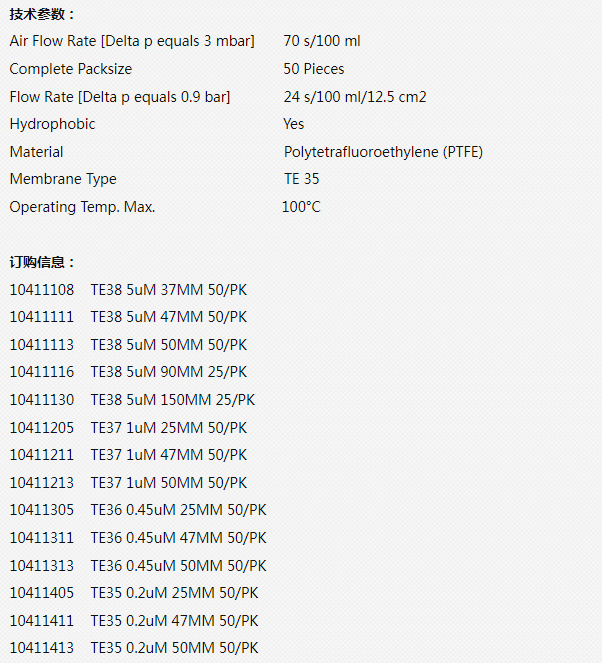 产品名称:Whatman0.2um孔径聚四氟乙烯TE35型PTFE滤膜